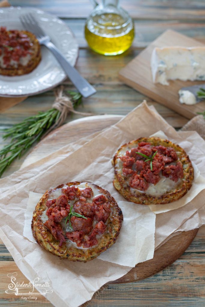 Facilissimi e Veloci: crostini di patate e salsiccia, un secondo piatto dalla bontà incredibile. Si tratta di una variante dei rosti di patate con gorgonzola e salsiccia sbriciolata che vengono cotti in forno e sono perfetti per una cena sfiziosa e diversa dal solito! Una ricetta che si prepara in pochi minuti, senza lessare le patate ma grattugiandole crude e usando un mixer a lame così da evitare che le patate rilascino acqua di vegetazione rendendo i crostini di patate morbidi e poco croccanti durante la gratinatura in forno.