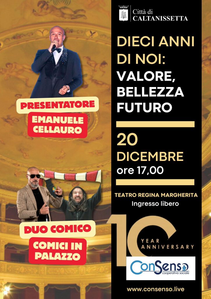 La cooperativa ConSenso celebra dieci anni di vita e sceglie di farlo in un luogo simbolico per la città di Caltanissetta: il teatro Regina Margherita, il 20 dicembre a partire dalle ore 17:00. Un evento, patrocinato dal Comune, che non vuole essere un’autocelebrazione, ma un momento di riflessione condivisa, di incontro e di riconnessione, orientato a ciò che è stato e, soprattutto, a ciò che ancora resta da costruire.