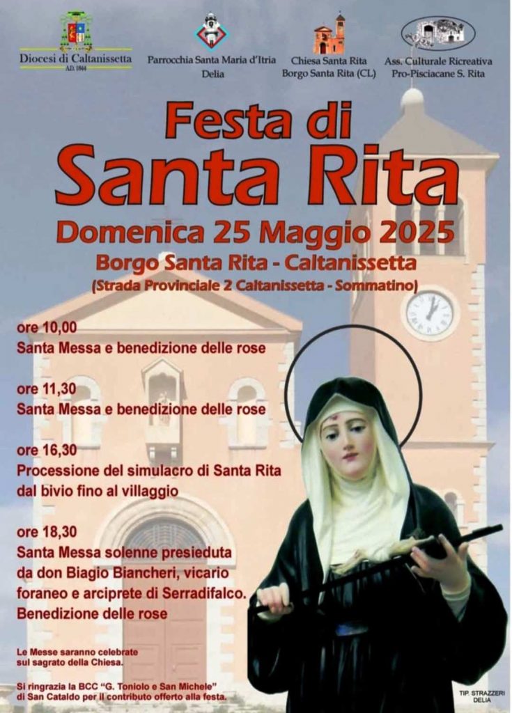 Il programma prevede la mattina due messe celebrate dal parroco della Chiesa dell’Itria di delia Don Lino De Luca, alle ore 10 e alle ore 11.30, nella chiesetta di Santa Rita situata nel punto più alto del borgo, e al termine di ognuna delle due messe ci sarà la benedizione delle rose. La festa proseguirà alle ore 16.30 con la processione con il fercolo con la statua di Santa Rita, che si svolgerà dal bivio per il Borgo Santa Rita della strada provinciale Delia-Sommatino, sino alla chiesa di Santa Rita nel borgo. Alle ore 18.30 ci sarà la Santa Messa Solenne celebrata da Don Biagio Bancheri vicario foraneo e arciprete di Serradifalco, e al termine la benedizione delle rose.