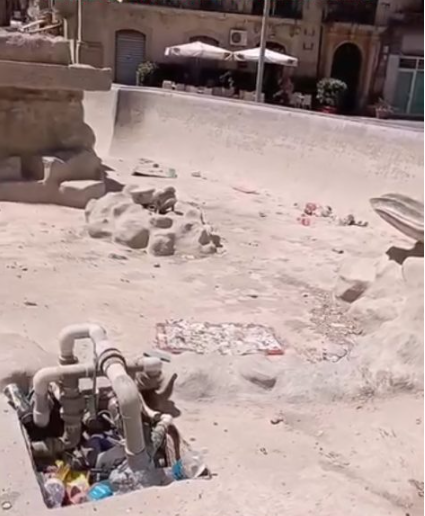 La Fontana del Tritone, vuota e piena di immondizia, con tutto il resto che la circonda…nulla da aggiungere.