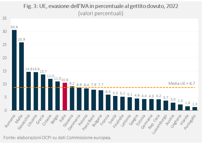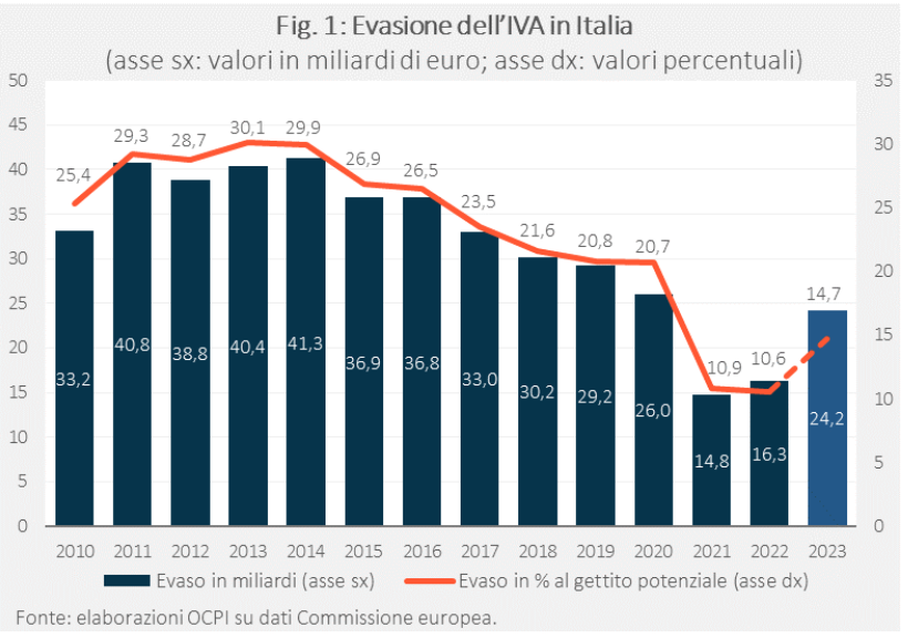 Secondo la Commissione europea l’evasione dell’IVA nel 2023 è salita dal 10,6% al 14,7% del dovuto. Tuttavia, il dato del 2021-2022 era stato particolarmente basso e quello del 2023 resta molto inferiore a quello del periodo 2010-2020. Resterebbe quindi confermata la riduzione tendenziale dell’evasione segnalata dalle stime dell’apposita commissione istituita dal Ministero dell’Economia e delle Finanze, il cui aggiornamento esteso al 2022 sarà però disponibile solo in primavera. Ciò detto, l’inversione di tendenza nelle stime della Commissione desta qualche preoccupazione. Inoltre, l’evasione dell’IVA in Italia rimane ben superiore sia alla media UE che ai valori di Francia, Spagna e Germania.