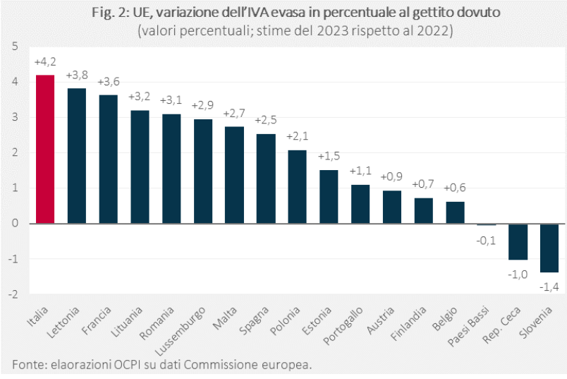 Per l’Italia, l’evasione dell’IVA è prevista in aumento dai 16,3 mld del 2022 ai 24,2 mld per il 2023. Rispetto al dovuto, l’evaso aumenta dal 10,6% al 14,7%. L’aumento stimato desta qualche preoccupazione per due motivi. Primo, perché rappresenta un’inversione di tendenza rispetto al decennio scorso (Fig. 1);[2] secondo, perché, rispetto al dovuto, è l’aumento più alto dell’intera Unione (Fig. 2), il che inciderà negativamente nella classifica dei Paesi dove si evade maggiormente l’imposta, dove già ora l’Italia è sopra a tanti altri Paesi. Infatti, se guardiamo al 2022 (anno in cui abbiamo i dati per tutta l’Unione), l’Italia è risultata all’ottavo posto in UE per evaso rispetto al dovuto, al di sopra sia della media UE (8,7%) che degli altri principali Paesi dell’Unione, come la Francia (6%), la Spagna (4,6%) e la Germania (4,3%).
