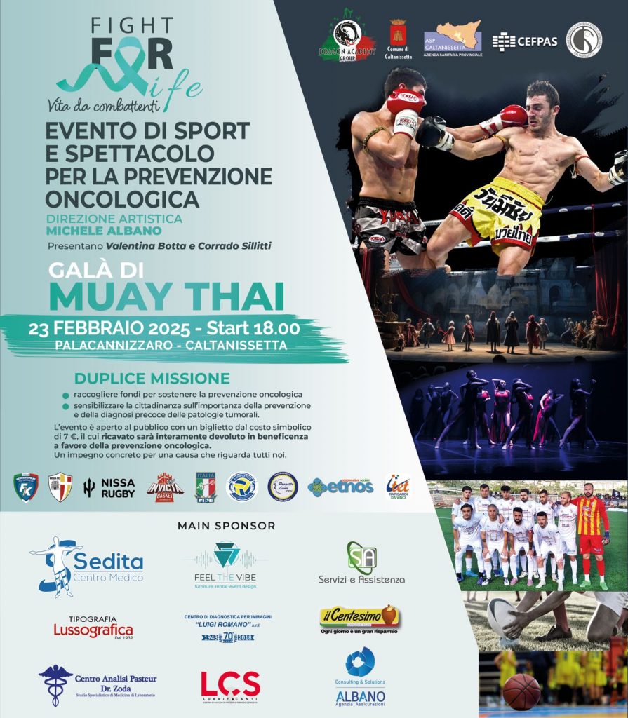 Dragon Academy Group presenta “Fight for Life”, un evento di lodevole significato, sostenuto da molteplici realtà del territorio e patrocinato dal Comune di Caltanissetta, che affiancherà lo spettacolo della disciplina del Muay Thai a momenti di informazione scientifica utili a sensibilizzare la nostra comunità sull’importanza di una diagnosi precoce delle patologie tumorali.