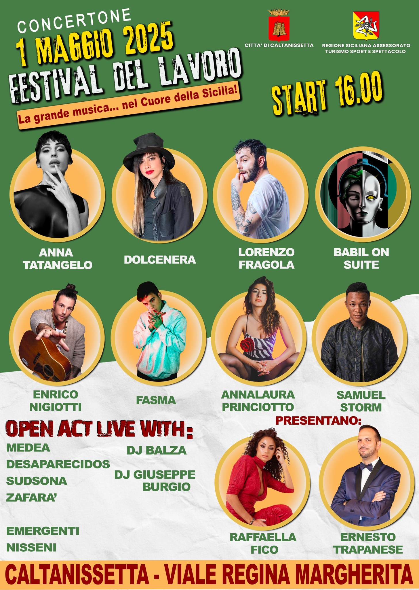 Con il D.D.S. n. 498/S6 del 04/03/2025 del Servizio 6 “Manifestazioni, spettacolo ed iniziative turistiche” Regione Siciliana, è stato finanziato dalla Regione Siciliana il “Festival del lavoro 2025 – 1° Maggio Siciliano a Caltanissetta” per € 200.000,00