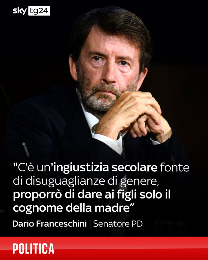 “Ai figli solo il cognome della madre”. È la proposta che l’ex ministro e senatore Pd, Dario Franceschini, presenterà al Senato. In base a quanto si apprende, Franceschini l’ha anticipata stamani all’assemblea del gruppo, che discuteva delle proposte di legge sul doppio cognome. “Anziché creare infiniti problemi con la gestione dei doppi cognomi o con la scelta tra quello del padre e quello della madre – è il ragionamento di Franceschini – dopo secoli in cui i figli hanno preso il cognome del padre, stabiliamo che dalla nuova legge prenderanno il solo cognome della madre. E’ una cosa semplice ed anche un risarcimento per una ingiustizia secolare che ha avuto non solo un valore simbolico, ma è stata una delle fonti culturali e sociali delle disuguaglianze di genere”.