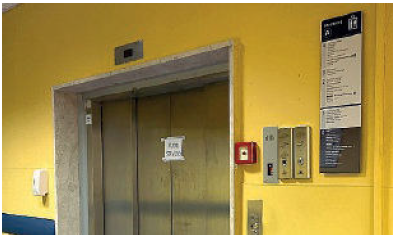 Un cartello indica che i due ascensori sono fuori uso, uno solo è attivo e serve per pazienti,