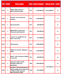 A seguire la tabella riepilogativa dei progetti e del relativo finanziamento.