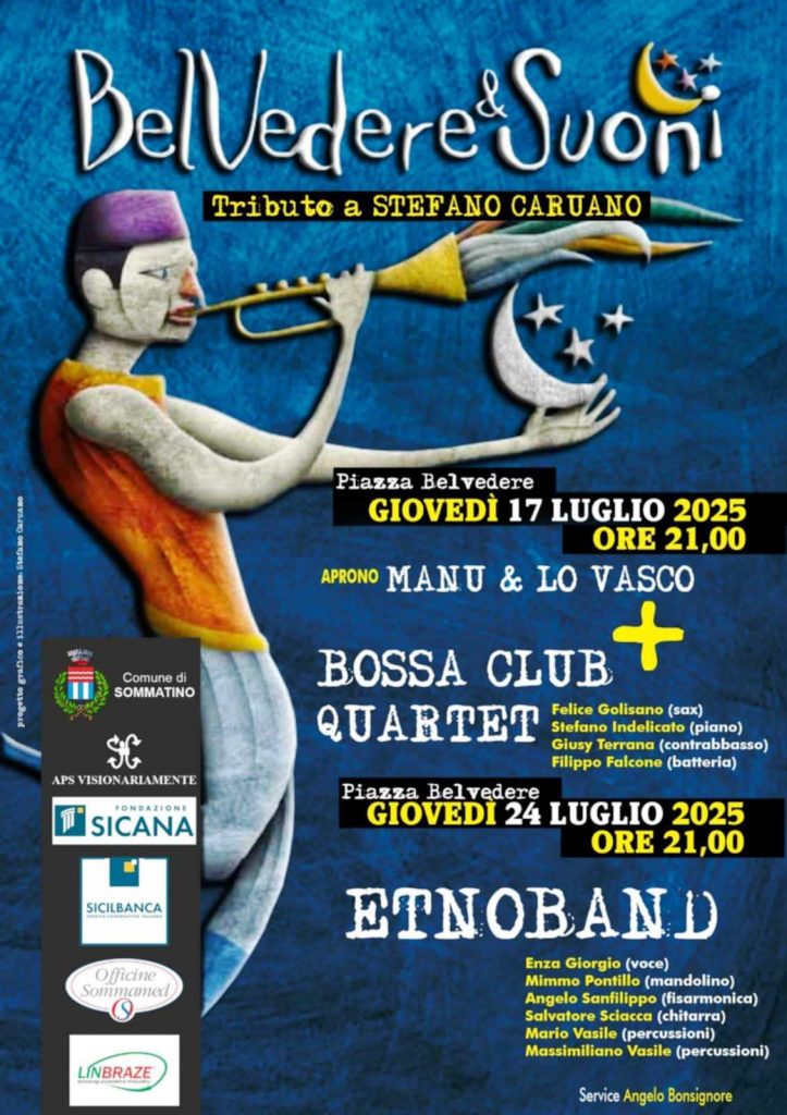 E così Giovedì prossimo 17 Luglio alle ore 21, con il supporto del Comune di Sommatino, della Fondazione Sicana e di alcuni sponsor privati, si esibiranno sul palco allestito nella Piazza Belvedere Manù e Lo Vasco, che apriranno il concerto, ed a seguire il Bossa Club Quartet composto da Felice Golisano al sax, Stefano Indelicato al piano, Giusy Terrana al contrabasso e Filippo Falcone, grande amico di Stefano Caruano, alla batteria.
