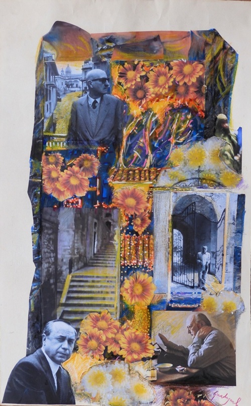 Una tela che mette in scena un incontro impossibile eppure verosimile. La sua opera convoca tre voci siciliane – Andrea Camilleri, Leonardo Sciascia e Gesualdo Bufalino – e le dispone come se fossero ospiti su una scalinata che guarda una piazza e un cancello di camposanto. I luoghi evocati non sono copie topografiche ma segni metaforici: la scalinata è memoria che sale, il cancello è soglia tra il detto e il taciuto, la piazza e la lunga strada attorno sono il teatro civile, dove si misura il valore della memoria. Ovunque crisantemi e altri fiori attendono con pazienza. Guadagnuolo offre così non soltanto un ritratto di tre autori ma un dispositivo drammatico in cui i ricordi trovano casa il 2 novembre.