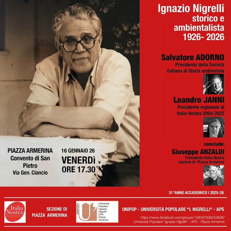 Venerdì 16 gennaio 2026, l’Università Popolare “Ignazio Nigrelli” di Piazza Armerina, a 100 anni dalla nascita di Ignazio Nigrelli, ricorderà la figura dello storico e ambientalista siciliano al quale l’associazione è stata intitolata nel novembre 2000, pochi mesi dopo l’improvvisa scomparsa. Co-organizzatrice dell’incontro è la sezione di Italia Nostra di Piazza Armerina.