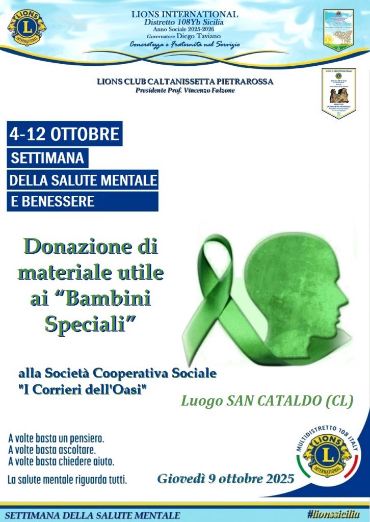 Nel quadro della Settimana della Salute Mentale e del Benessere, promossa dal Multidistretto 108 Lions Italia e alla quale ha aderito il Distretto Lions 108Yb Sicilia, il Lions Club Caltanissetta Pietrarossa ha donato un canestro alla Cooperativa sociale “I Corrieri dell’Oasi” di San Cataldo, che da anni si dedica con impegno ai bambini speciali.
