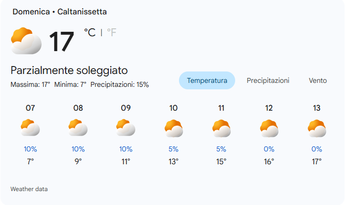 Per domenica 1 marzo 2026 a Caltanissetta si prevede una giornata parzialmente soleggiata con una temperatura massima di 17°C e una minima di 7°C.