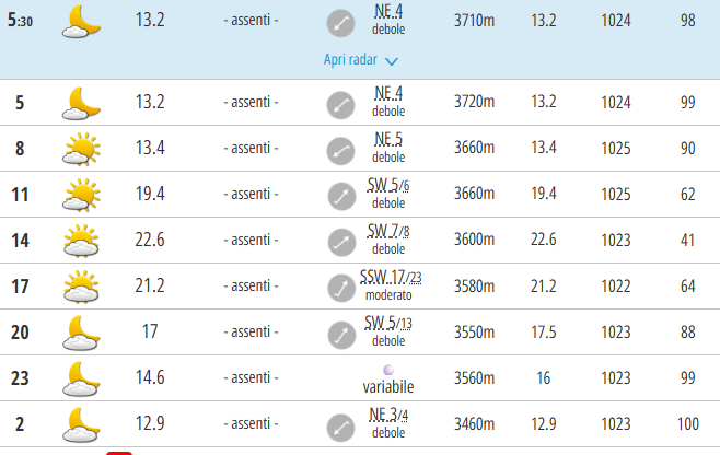 L’intensità solare più alta sarà alle ore 13 con un valore UV di 5.2, corrispondente a 757W/mq.