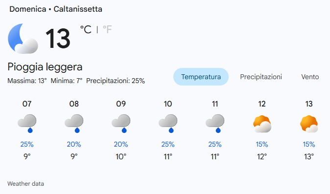 - Pomeriggio: Proseguono le condizioni di instabilità con piogge leggere (probabilità al 25%). La temperatura massima toccherà i 13°C.