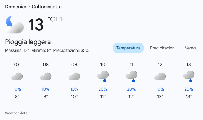 Per domenica 18 gennaio 2026 a Caltanissetta, si prevede una giornata con pioggia leggera sia di giorno che di notte, con temperature comprese tra una massima di 13°C e una minima di 8°C.