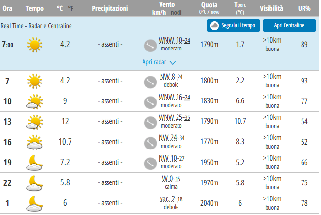 I venti saranno al mattino moderati provenienti da Ovest-Nord-Ovest con intensità tra 16km/h e 24km/h, moderati da Nord-Ovest al pomeriggio con intensità tra 25km/h e 35km/h, deboli da Ovest-Nord-Ovest alla sera con intensità tra 5km/h e 27km/h.