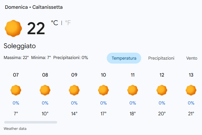 Per domenica 26 aprile 2026 a Caltanissetta, si prevede una giornata di pieno sole con temperature molto gradevoli, ideale per concludere il weekend all’aperto.