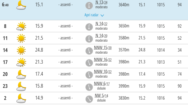 L’intensità solare più alta sarà alle ore 13 con un valore UV di 6.5, corrispondente a 848W/mq.Qualità aria: Molto buona
