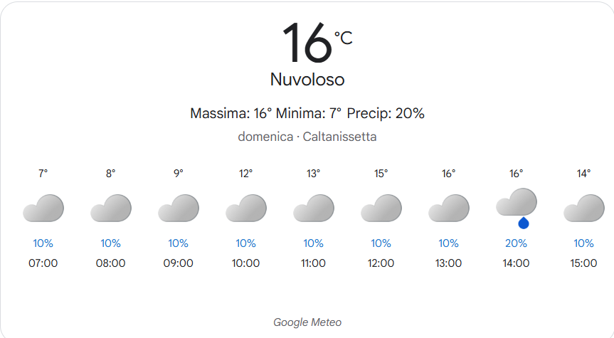 | 07:00 | Nuvoloso | 7^ | 88% | NW 10 km/h | 18 km/h |