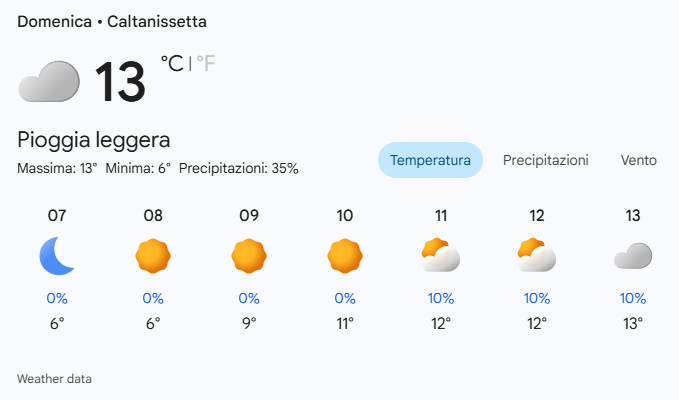 Per domenica 8 febbraio 2026 a Caltanissetta è prevista pioggia leggera sia di giorno che di notte, con una temperatura massima di 13°C e una minima di 6°C.