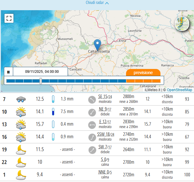 A Caltanissetta oggi sarà una giornata all’insegna di piovaschi alternati e schiarite, min 9°C, max 16°C.