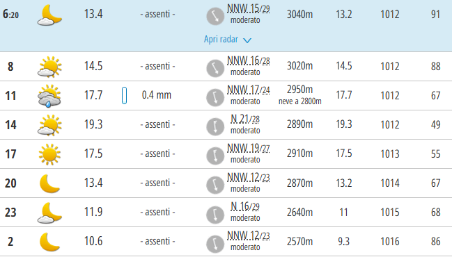 L’intensità solare più alta sarà alle ore 13 con un valore UV di 5.8, corrispondente a 798W/mq.