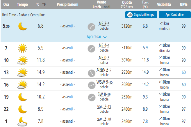 La visibilità più ridotta si avrà alle ore 5 e sarà di 210m. L’intensità solare più alta sarà alle ore 11 con un valore UV di 2.4, corrispondente a 512W/mq. Qualità aria: Buona