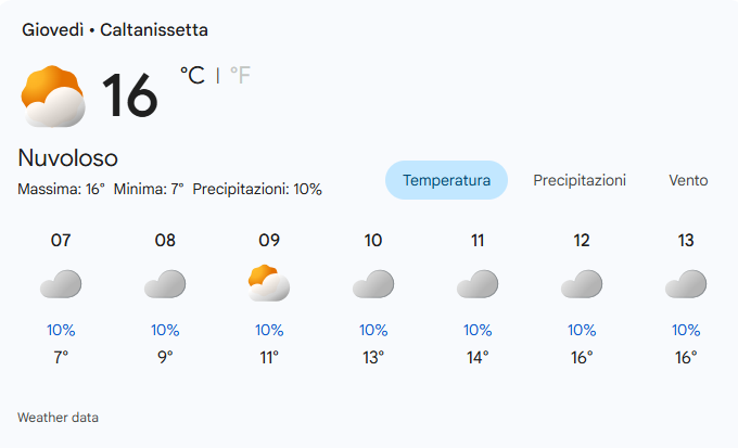 - Sera/Notte: Il cielo resterà prevalentemente nuvoloso. La probabilità di precipitazioni salirà leggermente durante la notte, arrivando al 15%.