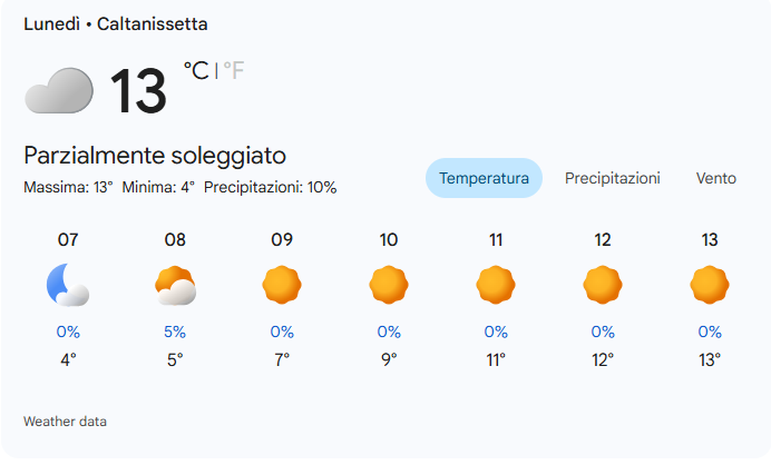 Lunedì 2 febbraio 2026 a Caltanissetta si prevede una giornata parzialmente soleggiata con una temperatura massima di 13°C, una minima di 4°C e venti da ovest a 11 mph.