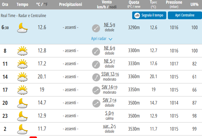 La visibilità più ridotta si avrà alle ore 8 e sarà di 260m. L’intensità solare più alta sarà alle ore 11 con un valore UV di 2.4, corrispondente a 516W/mq.