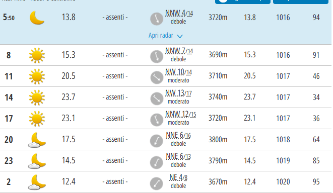 L’intensità solare più alta sarà alle ore 13 con un valore UV di 6.6, corrispondente a 851W/mq.