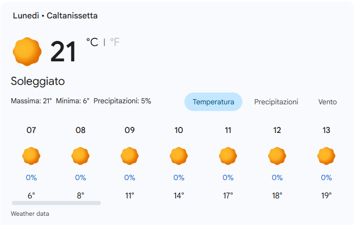 In sintesi: Una splendida giornata di primavera, ideale per qualsiasi attività all’aperto. Nonostante il tepore diurno, ricorda che l’escursione termica a Caltanissetta resta marcata: la sera avrai ancora bisogno di una giacca leggera.