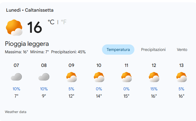 Lunedì 9 marzo 2026 a Caltanissetta sarà una giornata caratterizzata da pioggia leggera con una temperatura massima di 16°C e una minima di 7°C.