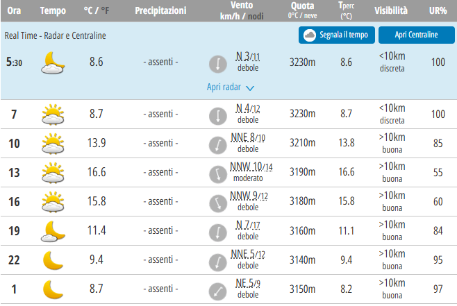 La visibilità più ridotta si avrà alle ore 5 e sarà di 460m. L’intensità solare più alta sarà alle ore 11 con un valore UV di 2.9, corrispondente a 565W/mq. Qualità aria: Buona