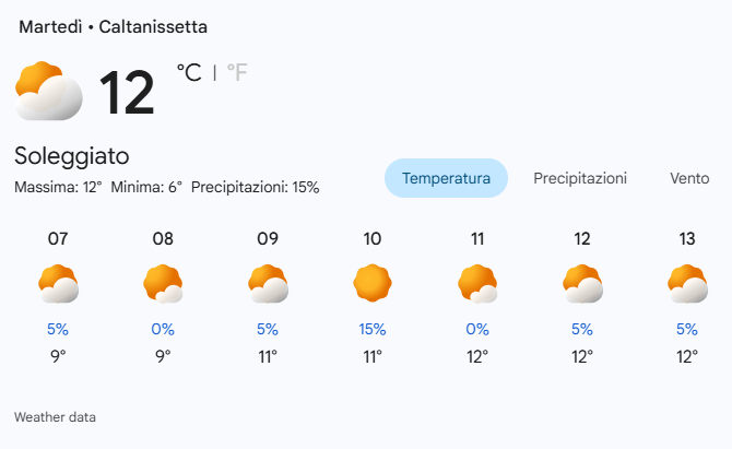 Martedì 17 febbraio 2026 a Caltanissetta sarà una giornata soleggiata con una massima di 12°C, una minima di 6°C e venti da nord-ovest a 25 mph.