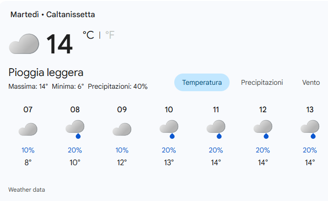 Martedì 17 marzo 2026 a Caltanissetta sarà una giornata caratterizzata da pioggia leggera e cielo prevalentemente coperto.