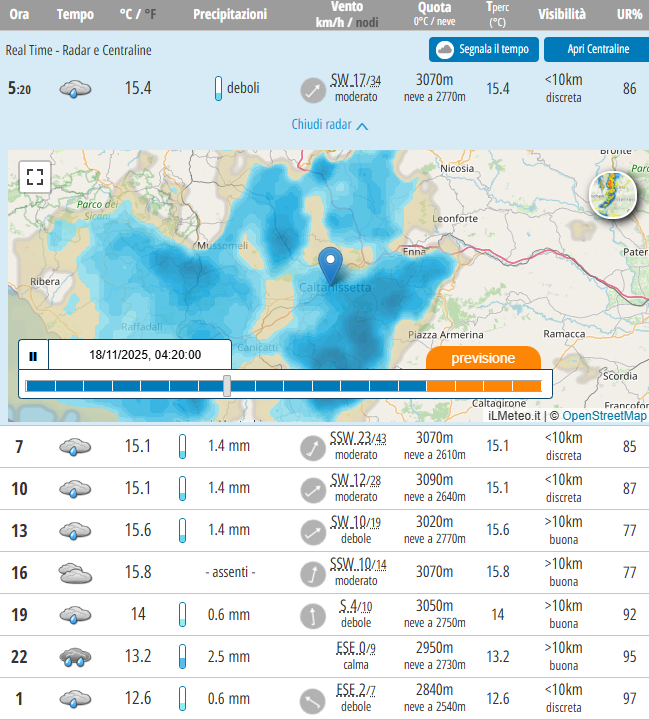 A Caltanissetta oggi sarà una giornata caratterizzata da pioggia debole, min 13°C, max 16°C.