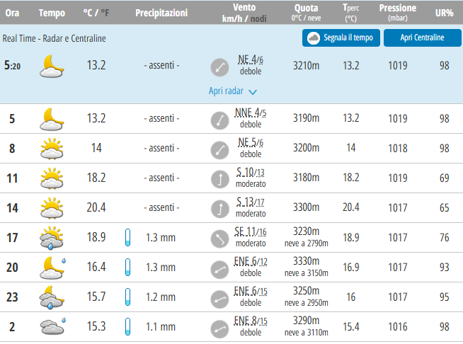 Durante la giornata di oggi la temperatura massima verrà registrata alle ore 14 e sarà di 20°C, la minima di 13°C alle ore 5, lo quota più bassa dello zero termico si attesterà a 3180m alle ore 11 e la quota neve minima sarà 2680m alle ore 17.