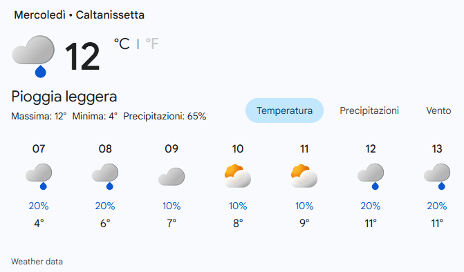 Per mercoledì 1 aprile 2026 a Caltanissetta si prevede pioggia leggera durante il giorno e cielo prevalentemente nuvoloso di notte, con una temperatura massima di 12°C e una minima di 4°C.