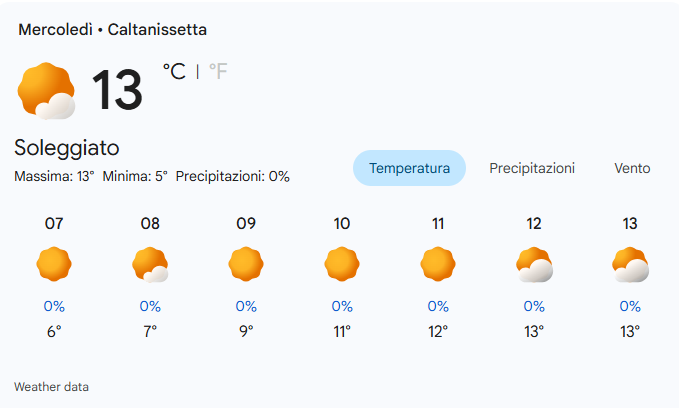 Mercoledì 18 febbraio 2026 a Caltanissetta sarà una giornata prevalentemente soleggiata, con una temperatura massima di 13°C e una minima di 5°C.