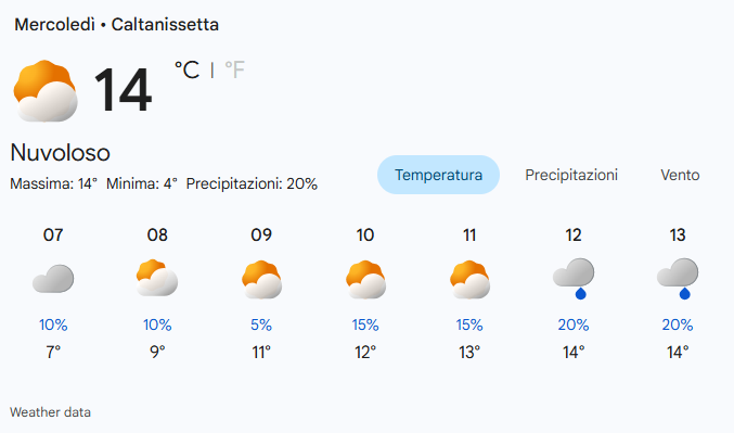 Per mercoledì 18 marzo 2026 a Caltanissetta si prevede una giornata nuvolosa con una probabilità di pioggia del 20% sia di giorno che di notte.