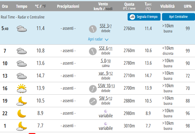 La visibilità più ridotta si avrà alle ore 6 e sarà di 3530m. L’intensità solare più alta sarà alle ore 12 con un valore UV di 0.8, corrispondente a 289W/mq.