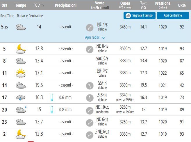 Durante la giornata di oggi la temperatura massima verrà registrata alle ore 14 e sarà di 19°C, la minima di 11°C alle ore 3, lo quota più bassa dello zero termico si attesterà a 3200m alle ore 20 e la quota neve minima sarà 2830m alle ore 18.