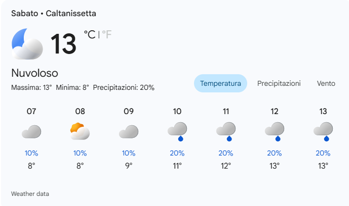 Per sabato 24 gennaio 2026 a Caltanissetta, è prevista una giornata nuvolosa con pioggia leggera durante la notte, una temperatura massima di 13°C e una minima di 8°C.