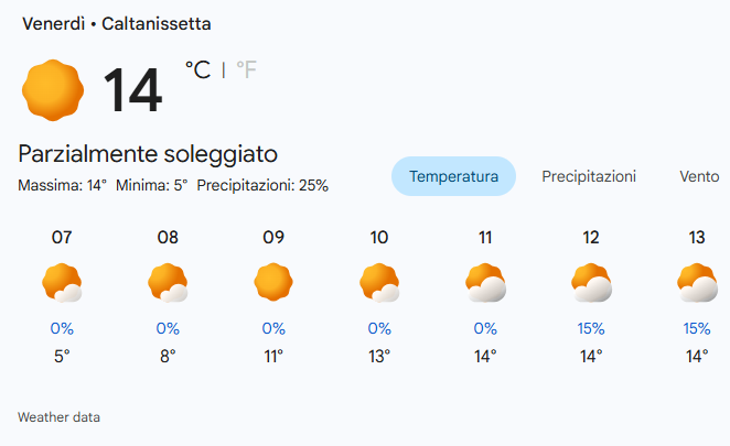 Per venerdì 13 marzo 2026 a Caltanissetta si prevede una giornata parzialmente soleggiata con una temperatura massima di 14°C e una minima di 5°C.