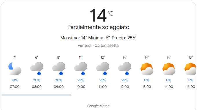 | Condizione | Parzialmente nuvoloso | Pioggia leggera |