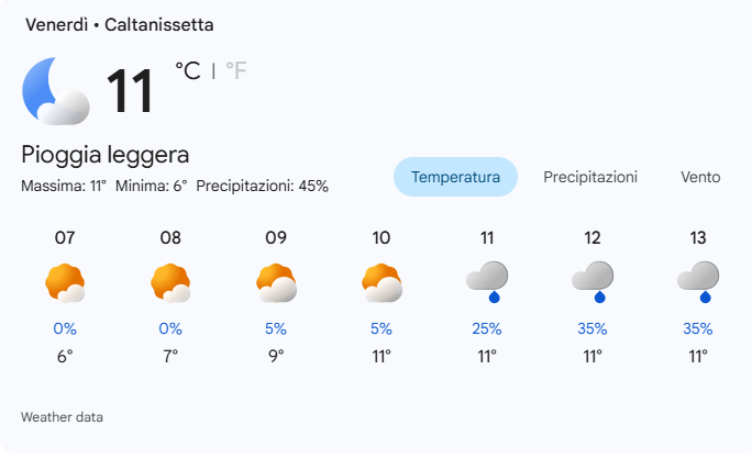 Per venerdì 20 febbraio 2026 a Caltanissetta si prevede una giornata variabile, caratterizzata da piogge leggere intermittenti alternate a schiarite.