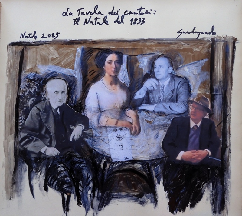 La mia opera La tavola dei cantori – Il Natale del 1833, è stata concepita come convivio natalizio, nasce da questa consapevolezza: immagino una stanza illuminata, un tavolo semplice che trattiene memorie, attorno al quale siedono Alessandro Manzoni con accanto la moglie Enrichetta Blondel, lo scrittore Mario Pomilio e la mia persona, in piedi, osservo la scena e rappresento il nostro tempo. In questo incontro immaginario, il passato e il presente si riconoscono e s’interrogano, le parole pesano come atti di responsabilità, la luce concentra i volti mentre fuori il mondo mostra le sue rovine. Non si tratta di un’illusoria parità di epoche, ma di un dialogo serrato tra le ferite del 1833 e quelle del nostro oggi, tra la voce degli Inni Sacri e le tragedie contemporanee di guerre, lutti e smarrimenti.