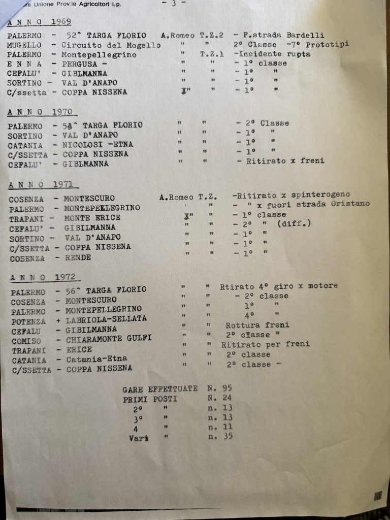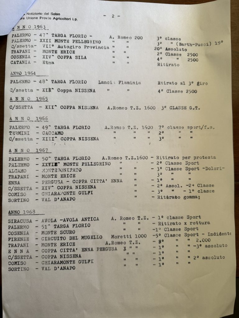 Dopo una breve parentesi a bordo di Lancia Flaminia, nel 1965 e fino a termine della carriera, prese il volante di un’Alfa Romeo TZ1 1600, targata CL 18880, auto che guidò alla Coppa Nissena, alla Targa Florio e a Pergusa.