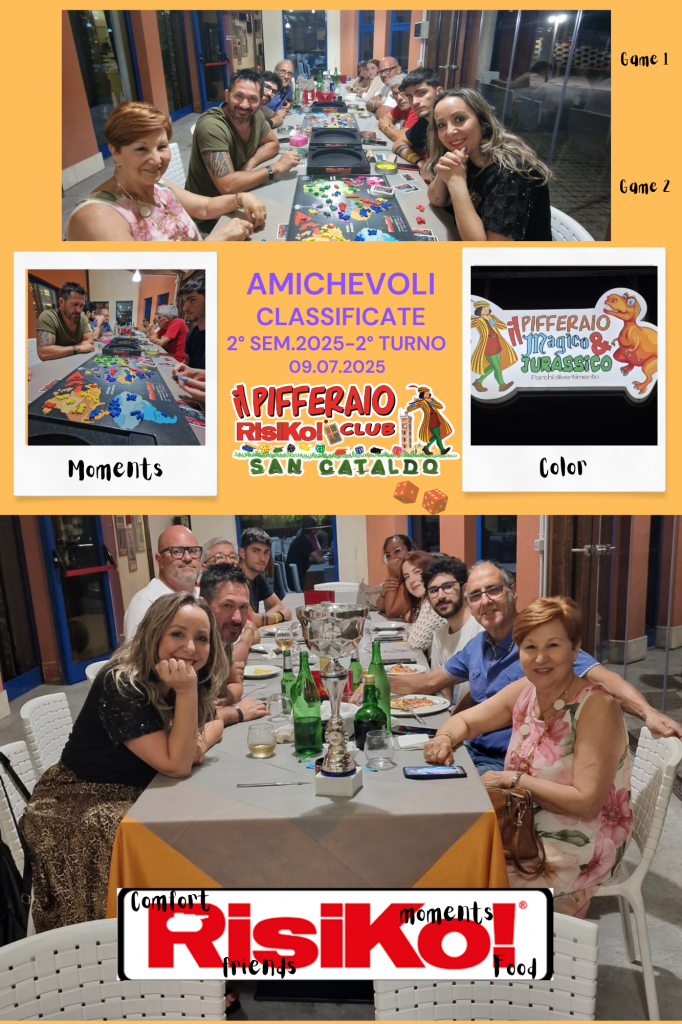 Appuntamento quindi a mercoledì’ sera 16 luglio, presso i locali della Nuova Locanda- Pifferaio Magico di San Cataldo, per la terza serata delle amichevoli classificate del 2° semestre 2025. Per chi fosse interessato a partecipare alle attività del Risiko Club Ufficiale “Il Pifferaio” si può contattare per ogni informazione i referenti Alessio Sansoni (tel.371/4566763), Mariella Brucculeri (tel. 331/6039772) e Gianluigi Orlando (tel 3291110564). Ci si può tenere informati anche attraverso le pagine social (Facebook, Instagram) del Club nelle quali saranno pubblicate le foto e i resoconti dei vari eventi che via via sono organizzati.